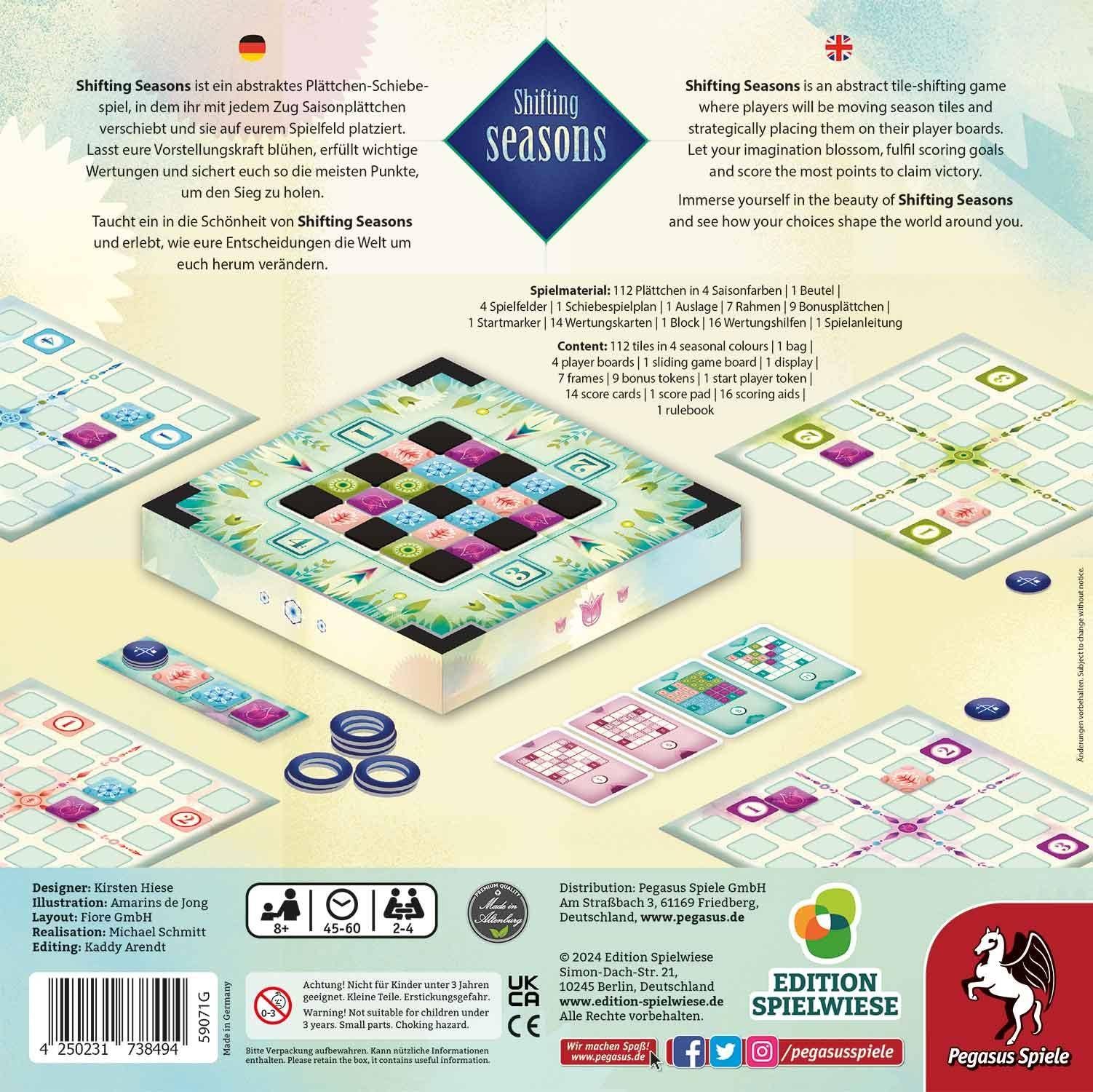 Shifting Seasons ist ein abstraktes Plättchen-Schiebespiel, bei dem die Spielenden Jahreszeitenplättchen auf bzw. vom Spielplan schieben, um sich besonders wertvolle Plättchen für das eigene Spielfeld zu sichern. Wer an der Reihe ist, nimmt eines der Plättchen aus der Auslage und schiebt es in eine der vier Bahnen des Spielplans. Damit wird auf der anderen Seite der Bahn ein Plättchen herausgeschoben. Die aktive Person darf dieses jetzt auf dem eigenen Spielfeld auslegen und zwar genau in dem Quadranten, der die Nummer zeigt, auf die das Plättchen geschoben wurde.