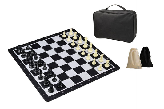 Schachset, rollbar, Feld 55 mm, mit Kunstofffiguren und Tragetasche, sprachunabhängig