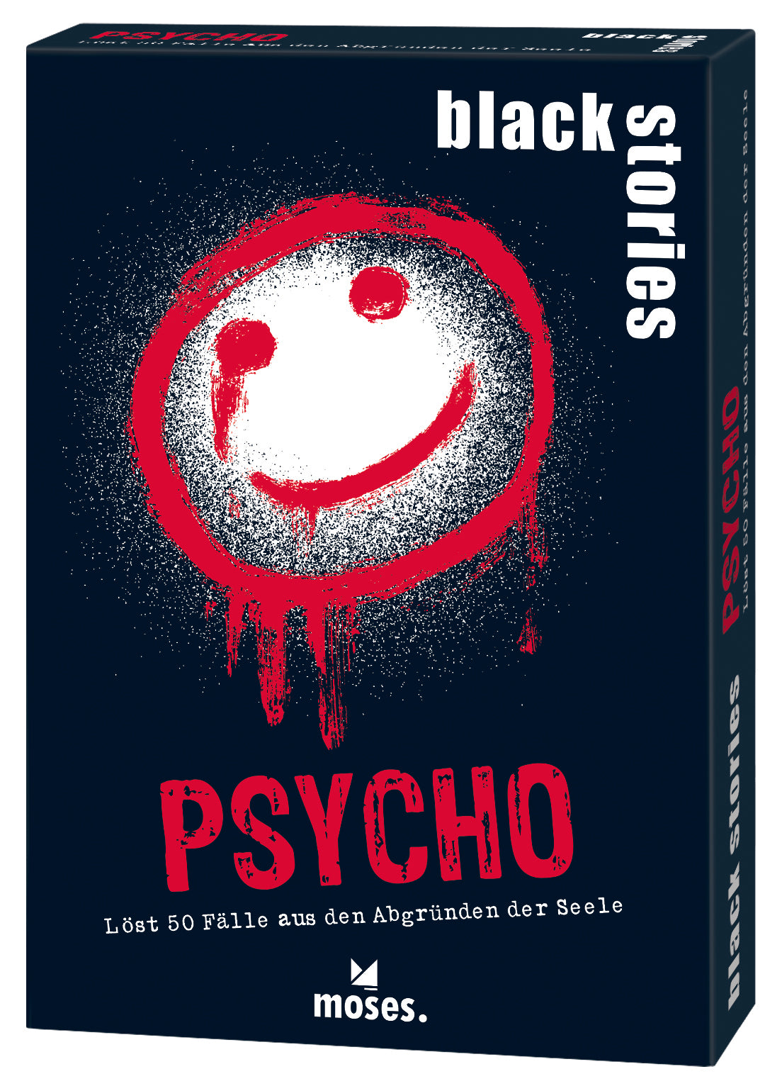 Sie sind schwarz, rätselhaft und durch und durch böse: black stories – Das ist DIE Kultreihe bei moses. In den morbiden, gruseligen, erschreckenden und zum Teil unterhaltsamen Rätseln geht es um den Tod und Unfälle, die nicht grauenhafter sein können. Warum führte eine schweißtreibende Schachpartie zum Tod eines Profispielers? Weshalb kam ein Autofahrer ums Leben, obwohl er seinen Unfall unverletzt überstand? Und wie konnte es passieren, dass ein Bodybuilder beim Zuschaustellen seiner Kräfte starb? Durch Raten sollen genau diese Geschichten dahinter herausgefunden werden. Nicht immer ganz so einfach…Skurrile Phobien, bizarre Psychosen, eigenartige Ticks und die ganze Bandbreite kurioser psychischer Störungen bieten jede Menge Stoff für rabenschwarze Rätsel. Medizinisches oder psychologisches Grundwissen ist nicht erforderlich, aber zu manischem Fragen, Raten und Tüfteln wird dringend geraten! In den black stories Psycho warten 50 rabenschwarze Rätsel aus den Abgründen der menschlichen Seele – natürlich samt Erklärung einzelner Fachbegriffe für die Extraportion Psychologie-Wissen!