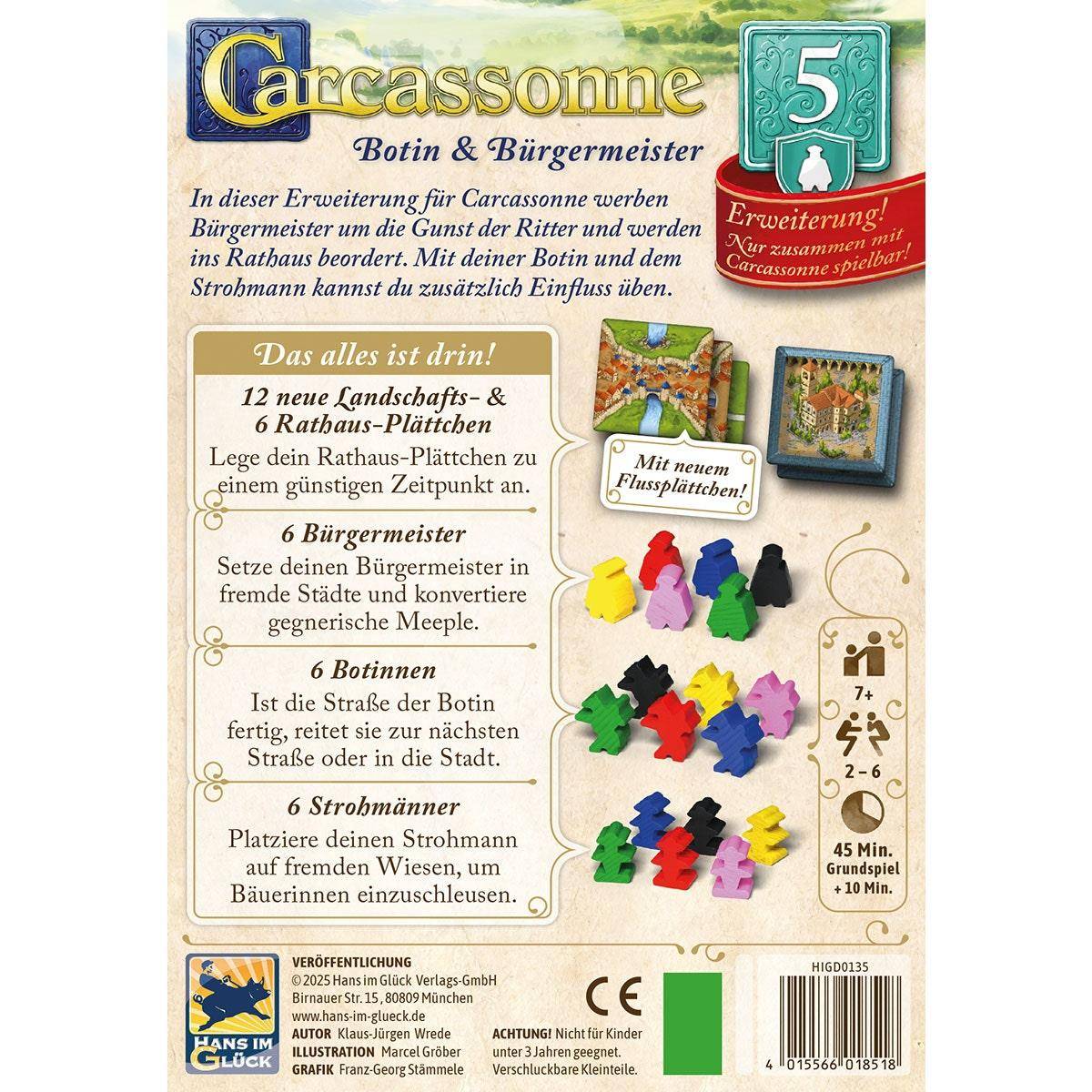 In der 5. Erweiterung Botin & Bürgermeister für das preisgekrönte Familienspiel Carcassonne (Spiel des Jahres 2001) werben Bürgermeister um die Gunst eurer Ritter und werden ins Rathaus beordert. Setzt euren Bürgermeister in fremde Städte und konvertiert gegnerische Meeple. Mit eurer Botin und dem Strohmann könnt ihr zusätzlichen Einfluss ausüben. Ist die Straße der Botin fertig, reitet sie zur nächsten Straße oder in die Stadt. Platziert euren Strohmann auf fremden Wiesen, um Bäuerinnen einzuschleusen.