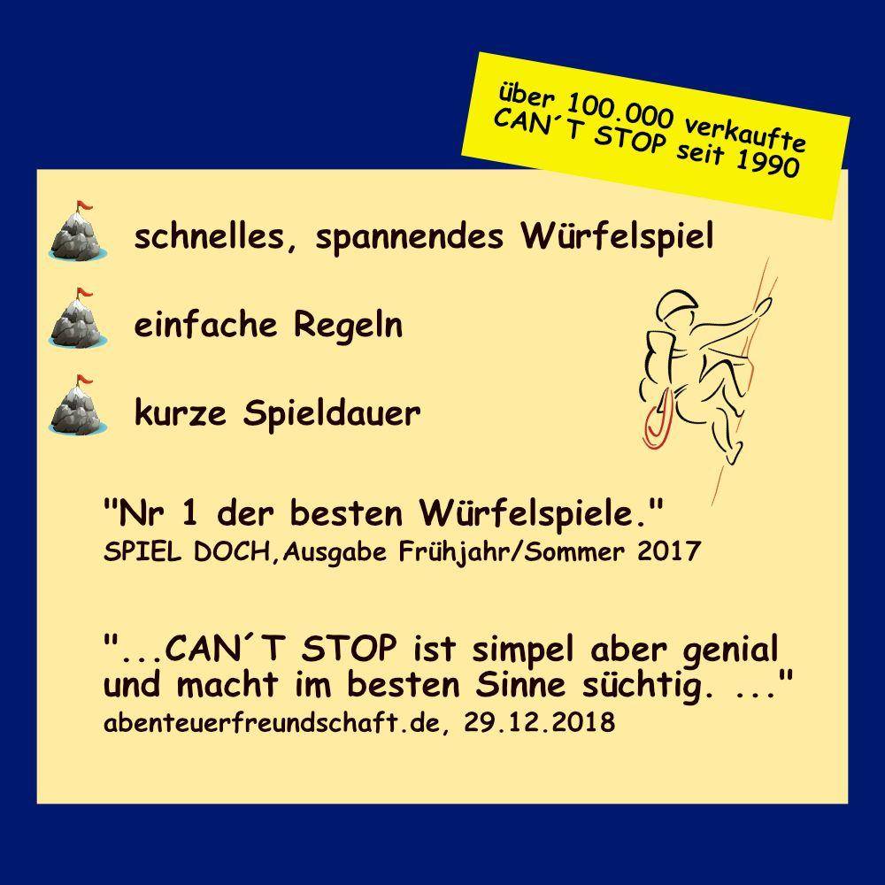 So sind die Spieler ständig hin- und hergerissen zwischen Weiterwürfeln (Risiko) und "Zwischenlager" einrichten (Sicherheit). Aber wie der Titel schon sagt: CAN'T STOP - man kann einfach nicht aufhören.