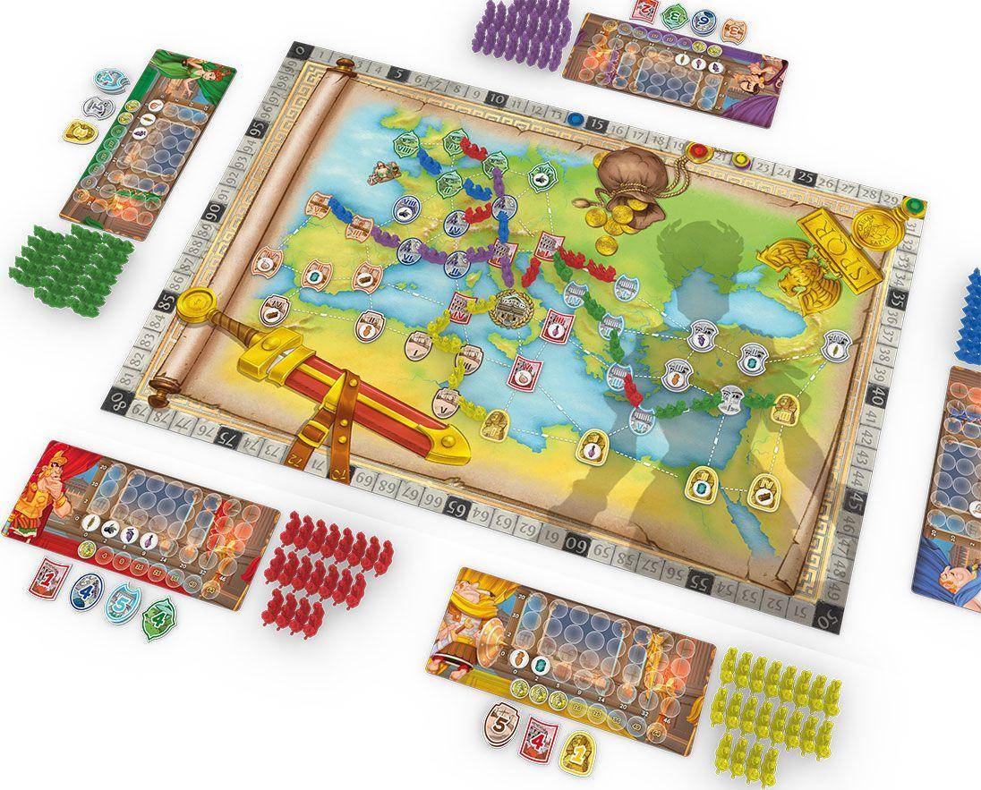 In Cäsars Imperium führen buchstäblich alle Wege nach Rom. Angesiedelt in der beliebten Welt von Asterix und Obelix dreht sich in diesem schnellen Familienspiel alles um die Hauptstadt der Römer. In einem spannenden Rennen um Waren und Städte wetteifert ihr darum, Verbindungen zwischen Rom und den Städten im Umfeld zu legen. Wer eine Stadt als Erster erreicht, erhält nicht nur die Ware dort, sondern auch den Stadtmarker. Gleichzeitig werden die Straßen nach Rom mit Punkten belohnt. Aber passt auf, welche Strecken ihr legt: Jeder Weg der Mitspieler, den ihr verbindet, gibt ihnen Punkte. Wer am Ende am meisten Punkte zum Ruhme Roms beisteuert, gewinnt.