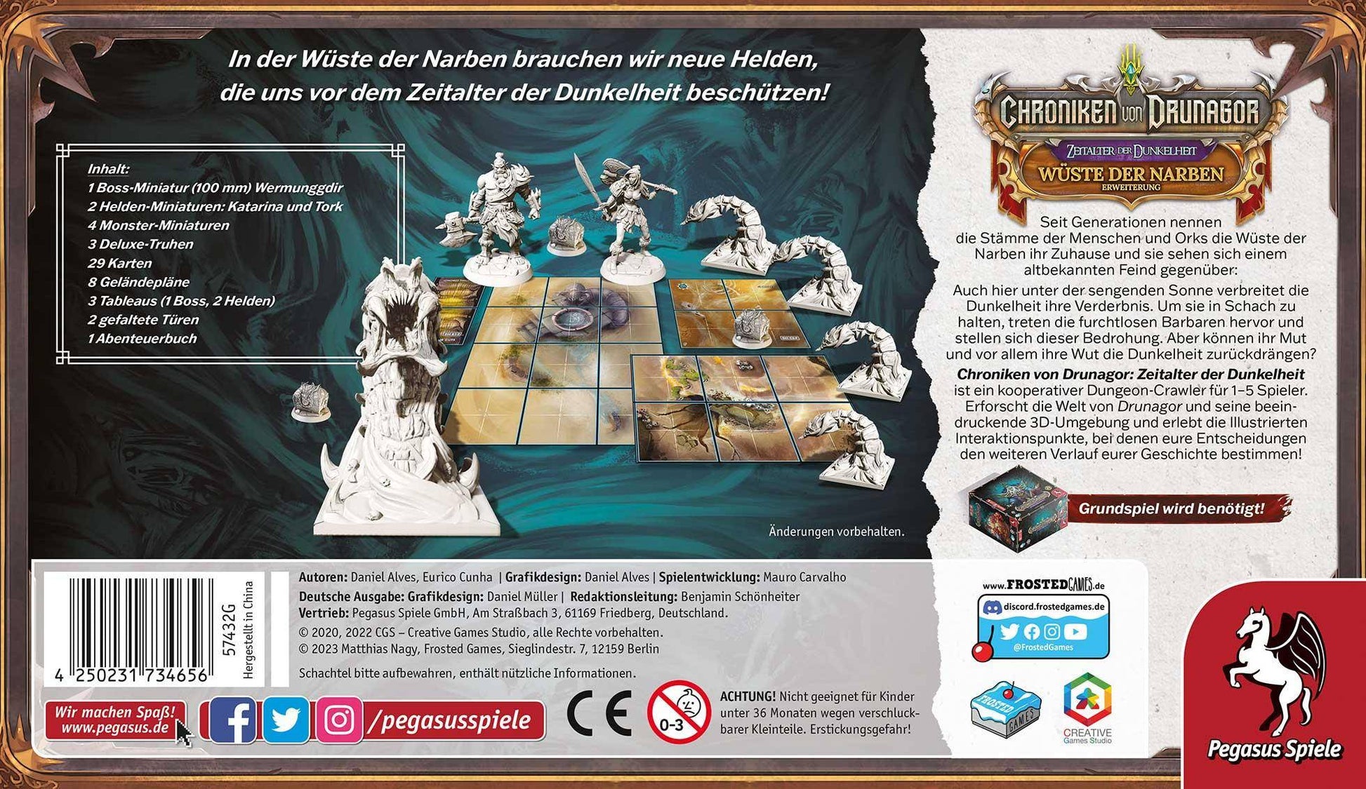 In der Erweiterung Chroniken von Drunagor: Wüste der Narben müssen sich die Spielenden in drei neuen Abenteuern dem neuen, erbarmungslosen Bossgegner Wermunggdir stellen! Sie kämpfen mit den Barbar*innen Katarina und Tork gegen diesen riesigen, bleichen Wurm aus den Tiefen der Wüste. Die Erweiterung fügt dem Spiel den Gegnertyp Verdorbener Lindwurm hinzu. Ebenfalls mit dabei sind 16 neue Geländepläne, 3 Truhen, 2 neue Türkarten und ein Abenteuerbuch, das mindestens 10 Stunden Spielzeit verspricht.
