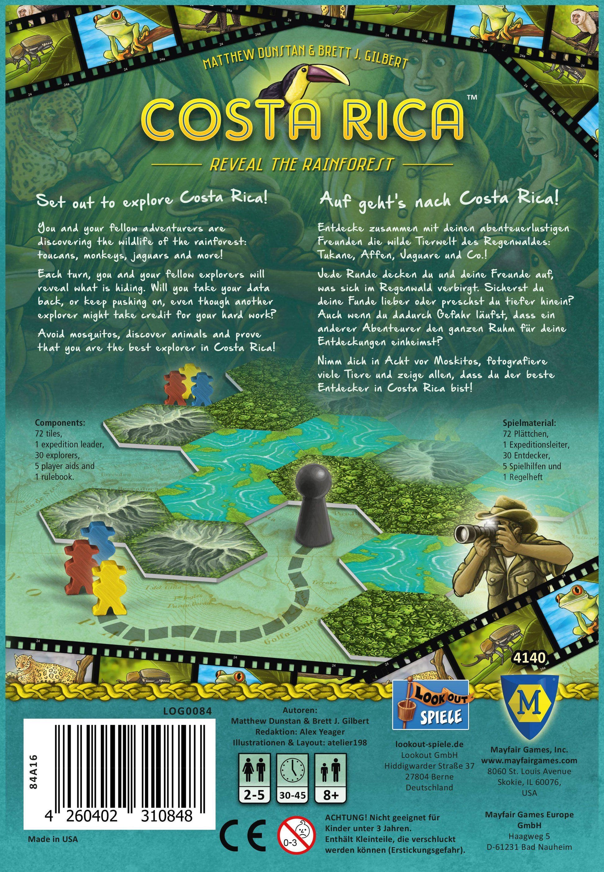 Im Familienspiel Costa Rica schlüpft ihr in die Rolle von Entdeckern und seid auf der Suche nach exotischen Tieren im Regenwald von Costa Rica. Diese tummeln sich in den Flüssen, Wäldern und dem Hochland der tropischen Insel und es gilt, so viele Tiere wie möglich aufzuspüren.