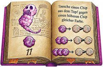 Jeder der bis zu vier mitspielenden Quacksalber kocht hier sein eigenes Süppchen. Zutat um Zutat wird hierfür aus dem eigenen, im Laufe des Spiels selbst zusammengestellten Vorratsbeutel gezogen. Doch Obacht: eine Prise zu viel von den Knallerbsen und die ganze Mischung ist verdorben. Da heißt es geschickt zur rechten Zeit aufhören und lieber nur ein kleineres Portiönchen kochen, um mit den hierfür gewonnenen Erträgen noch wertvollere Zutaten zu erwerben. Dann wird der nächste Trank sicher noch besser munden und viele wertvolle Siegpunkte einbringen.