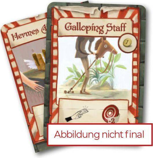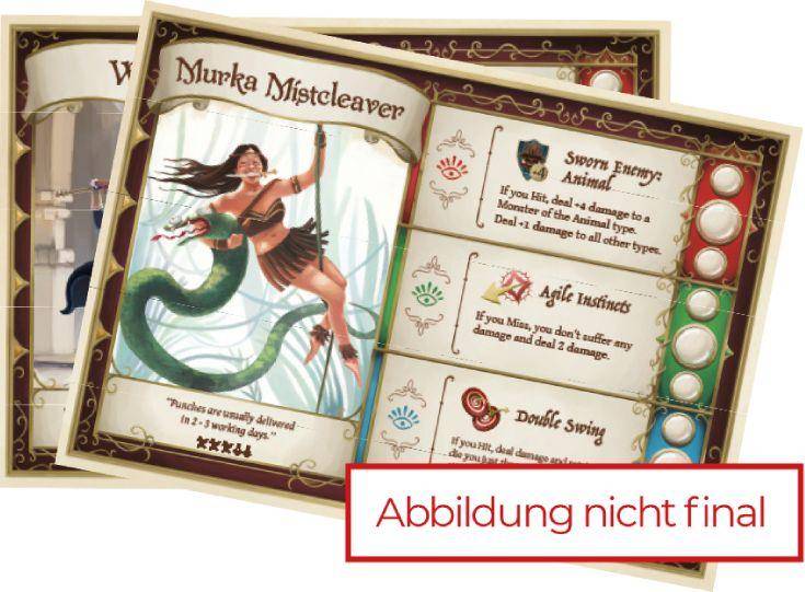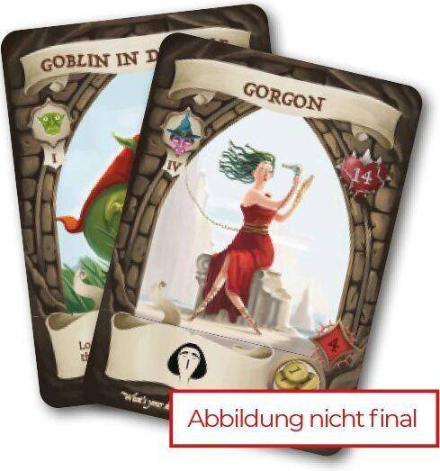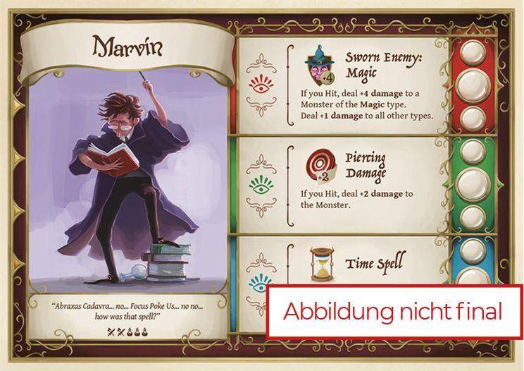 Für jeden Sieg bekommt ihr Belohnungen – und für jede Niederlage fiese Narben, aber daran wollen wir jetzt erstmal nicht denken. Und wenn ihr Glück habt, steht hinter dem nächsten Baum der fliegende Dungeonhändler und verkauft euch für ein paar lumpige Goldmünzen Rüstungen, Waffen und modischen Helden-Schnickschnack. Denn natürlich müsst ihr euch wappnen, um euch am Ausgang des Labyrinths dem dam-dam-dam-dam...Endgegner zu stellen.Und so laufen diese stürmischen Kämpfe ab: Wer angreift wirft einen Würfel auf die Zielscheibe. Ja richtig gelesen, hier wird GEWORFEN und NICHT GEWÜRFELT. Je nachdem wo der Würfel zu liegen kommt, fügt ihr dem Monster den auf der Scheibe angezeigten Schaden zu. Und durch die Würfelseiten können obendrein supercoole Sondereffekte ausgelöst werden. Soweit so einfach, aber manche Monster können nur an ihrer Schwachstelle erwischt werden und dafür müsst ihr dann ein ganz besonderes Manöver hinlegen, wie z. B. den Angriffswürfel von der Tischkannte schnippen, ihn blind werfen oder ihn auf die Zielscheibe blasen.
