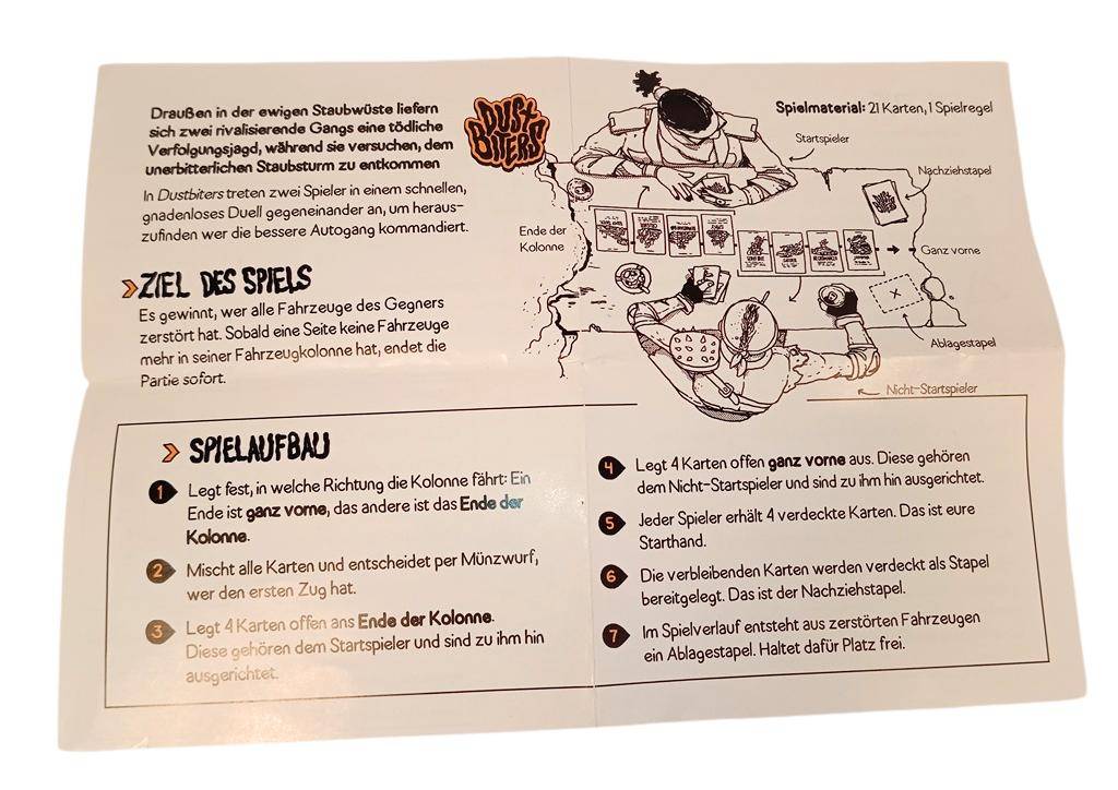 DUSTBITERS ist eine Zusammenarbeit zwischen einigen der besten, coolsten und verrücktesten Menschen, die zufällig auch preisgekrönte Spieledesigner und Illustratoren sind (siehe unten für den vollständigen Lebenslauf). Es ist auch das erste lokalisierte Spiel von King Racoon Games. DUSTBITERS ist schnell zu erlernen und leicht zu verstehen. Es gibt nur sehr wenige Regeln, aber unendlich viele kreative Möglichkeiten, sich aus einer schwierigen Situation zu befreien. Autos sind *alles*. Es gibt keine Spielsteine, keine Mathematik, keine Würfel. Nur Autos. Jedes Auto ist einzigartig und beeinflusst seine Umgebung auf unterschiedliche und überraschende Weise. Während deines Zuges hast du 3 Aktionen, die du auf verschiedene Weise einsetzen kannst. Um zu gewinnen, musst du deine Autos geschickt einsetzen, um deinen Gegner zu zerstören – oder ihn auszustechen. Aber vergiss nicht: am Ende jedes Zuges zerstört der Staubsturm das Auto, das sich am Ende des Konvois befindet!