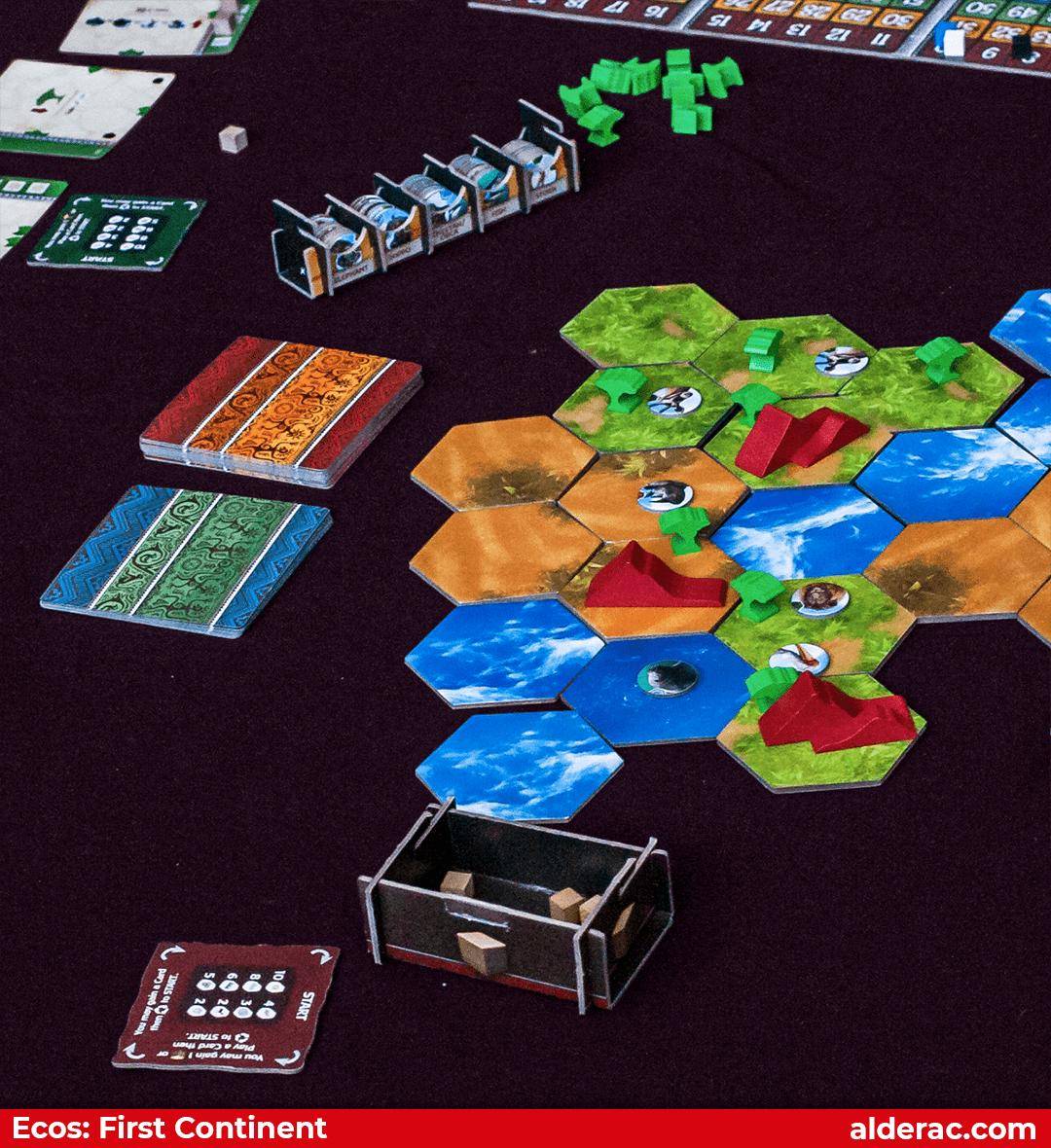 Ecos ist ein simultanes Spiel für. Elemente, gezogen aus dem Element-Beutel, geben allen Spielern die Chance ihre Karten zu vervollständigen und den Kontinent nach ihrer Vision zu formen.