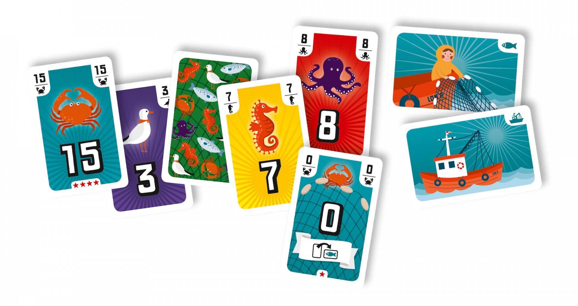 In Fischen versucht ihr über 8 Runden möglichst viele Stiche zu fangen, denn jede gefangene Karte zählt 1 Punkt. Mit euren gefangenen Karten spielt ihr dann in der nächsten Runde weiter. Habt ihr dafür nicht genug Stiche gefangen, dürft ihr eure Hand mit frischen Karten vom Meeresstapel auffüllen.
