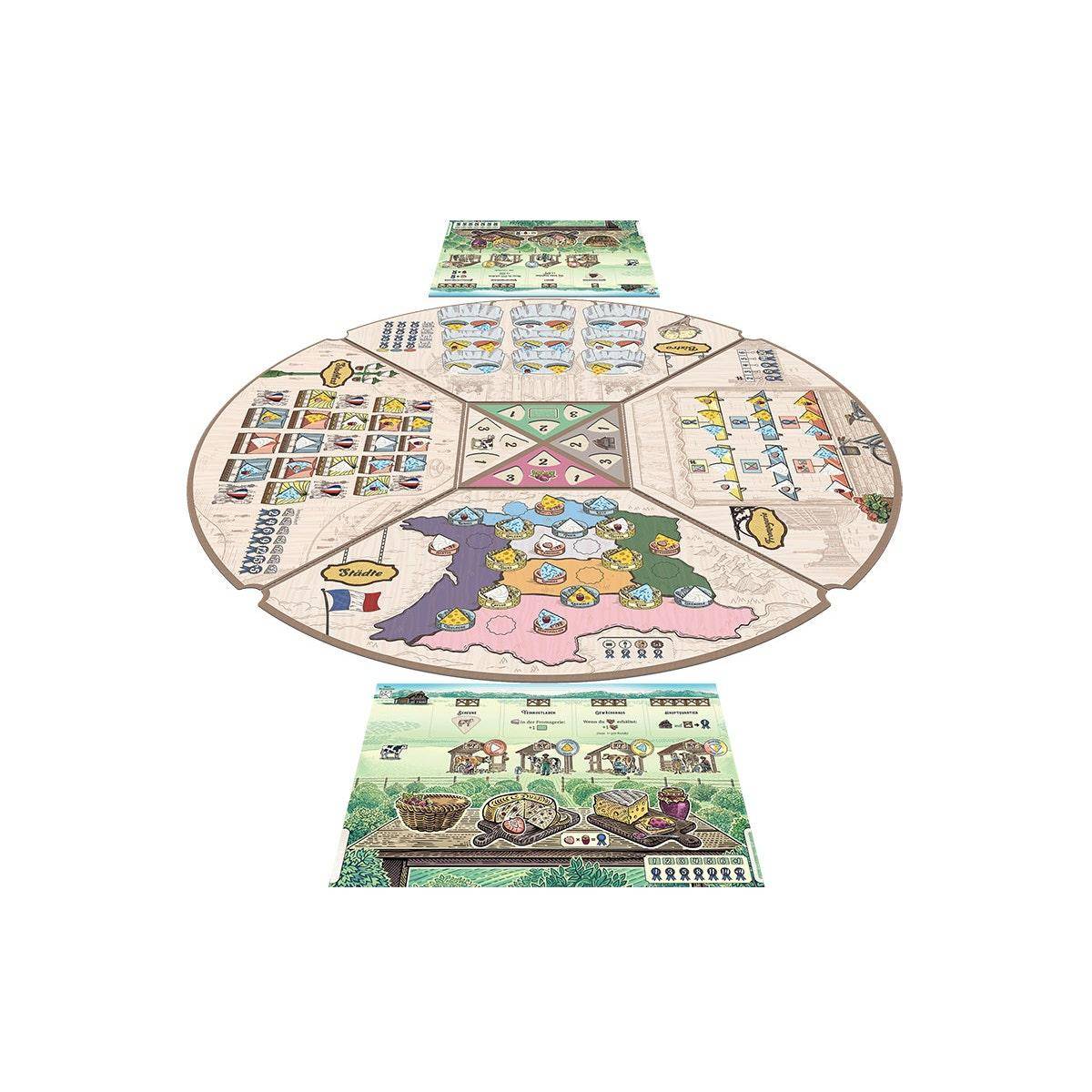 Fromageist ein simultanes Worker-Placement-Kennerspiel, bei dem ihr Hart-, Weich- oder Blauschimmelkäse herstellt und Ressourcen aus dem Quadranten des Spielbretts sammelt, der euch gerade zugewandt ist. Sobald alle Spieler ihre Arbeiter platziert haben, dreht sich das Spielbrett, wodurch der hergestellte Käse reift und jeder von euch einen neuen Quadranten mit anderen Einsatz- und Punktemöglichkeiten erhält. Lasst ihr euren Käse schneller reifen und bekommt ihn schon nach einem Zug zurück oder produziert ihr hochwertigeren, länger gereiften Käse, aber müsst dabei bis zu drei Züge lang auf euren Arbeiter verzichten? Nebenbei könnt ihr eure asymmetrischen Spielertableaus ausbauen und Aufträge von Kunden erfüllen, um noch erfolgreicher zu werden.