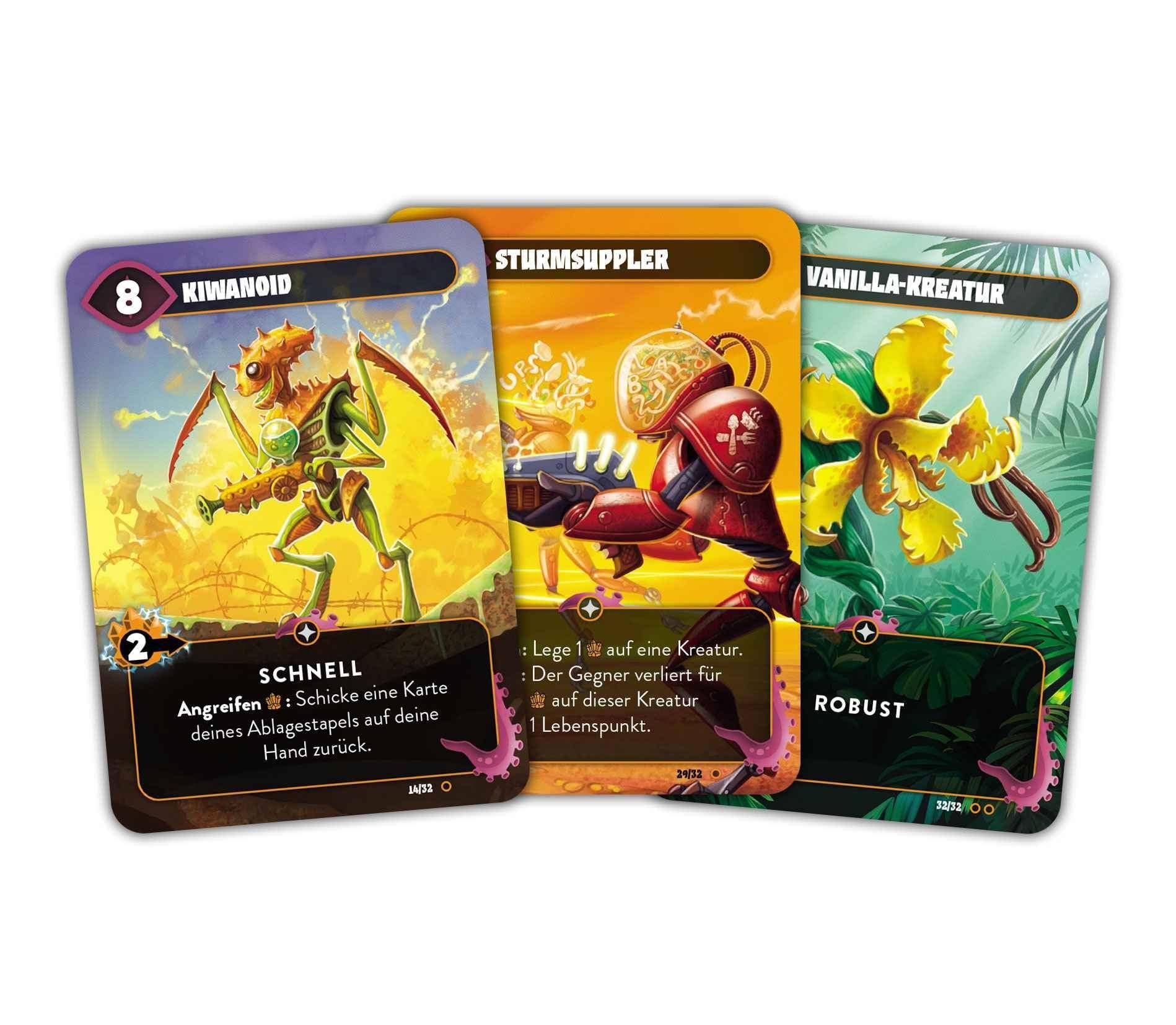 Im Weltall wachsen die Früchte anders – mächtiger, gefährlicher, abgefahrener! In Galaxie der Kampffrüchte entfesselst du die oktonit-geladene Energie bizarrer Sci-Fi-Kreaturen und trittst in schnellen, taktischen Kartenduellen gegen deinen Gegner an. Nutze ihre Spezialfähigkeiten clever – oder stiehl ihm mit deinen Mindbugs im richtigen Moment seine besten Kreaturen!
