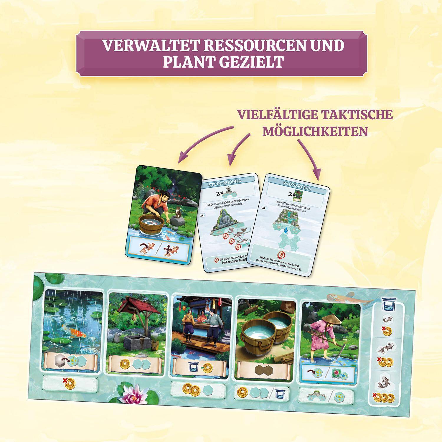 Ein leises Plätschern, das Glitzern der Sonne auf dem Wasser – prachtvolle Koi ziehen gemächlich ihre Bahnen. In Koi entsteht Zug um Zug ein kunstvoll gestalteter Gartenteich, in dem elegante Fische zwischen Seerosen und Steinen ihre Kreise ziehen. Koi auf transparenten Acrylplättchen werden ins Wasser gesetzt und verleihen dem Teich eine faszinierende Tiefe. Wer geschickt plant, wählt passende Teichkarten, vergrößert das Gewässer und schafft die ideale Umgebung für wertvolle Karpfen. Unterschiedliche Aufgabenkarten sorgen dafür, dass jede Partie neue Herausforderungen bereithält. Ob im Solo-Modus oder im Wettbewerb – das wunderschön illustrierte Spiel bietet taktische Vielfalt und stimmungsvolle Entspannung für ein bis vier Spielerinnen und Spieler ab zwölf Jahren.