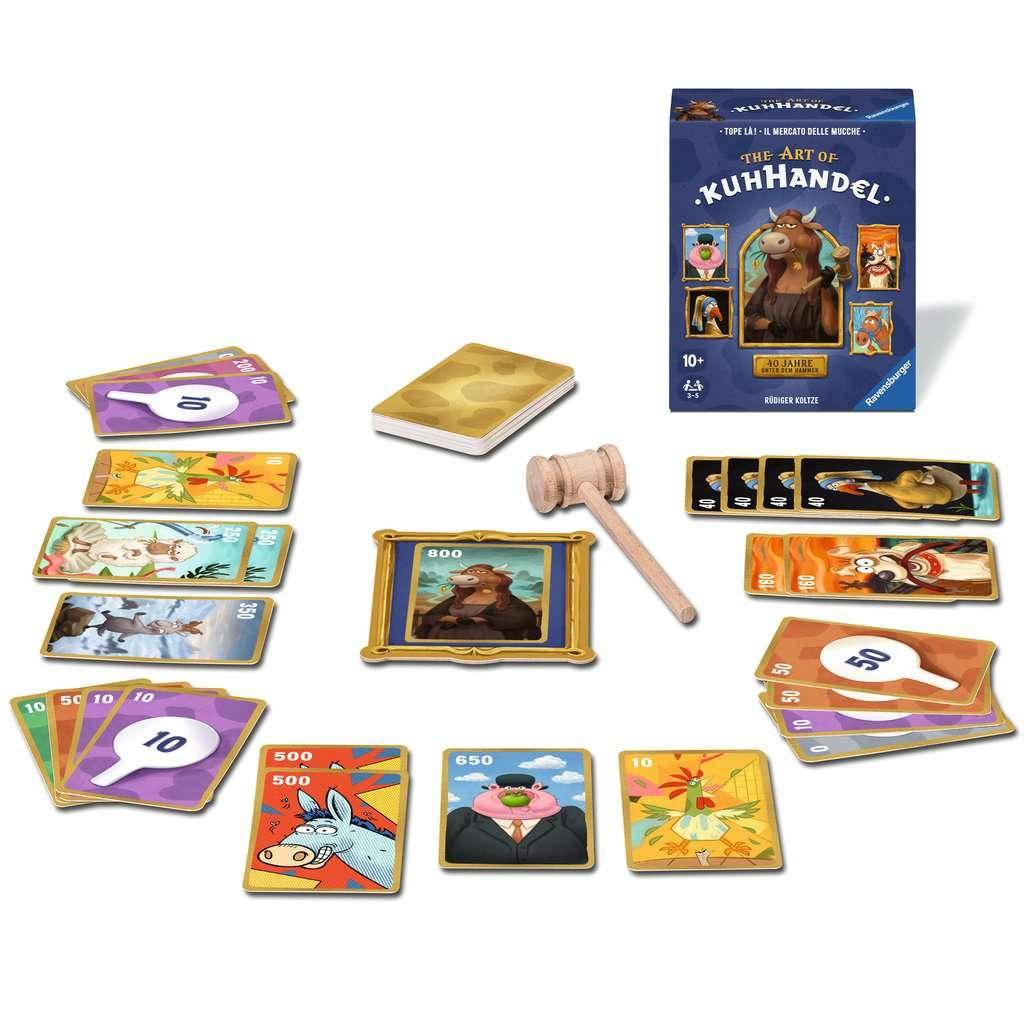 40 Jahre 'Kuhhandel' - das ist der Hammer! Und genau deswegen liegt diesem Versteigerungsspiel-Klassiker für 2-5 Spieler:innen auch einer bei ...40 Jahre „Kuhhandel“ – Das ist der Hammer! Und genau deswegen liegt dem Spiel für 2-5 Auktionsliebhaber auch einer bei! Selbst die Tiere haben sich für das Jubiläum besonders in Schale geworfen und zeigen sich nun im Stil alter Meister, ein Kuhnstgenuss der Gans besonderen Art! Also, schnappt euch den Hammer und schlagt bei den vielen Auktionen zu. Gewinnt die wertvollsten Tierquartette, macht die meisten Siegpunkte. Und freut euch auf die zahlreichen neuen kuhlen Spielvarianten!