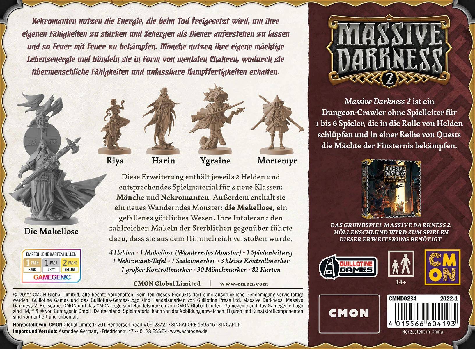 Die Erweiterung Mönche & Nekromanten gegen die Makellose für den Dungeon-Crawler Massive Darkness 2: Höllenschlund enthält jeweils zwei Helden und das entsprechende Spielmaterial für zwei neue Klassen: Mönche und Nekromanten. Außerdem enthält sie ein neues Wanderndes Monster: die Makellose, ein gefallenes göttliches Wesen. Ihre Intoleranz den zahlreichen Makeln der Sterblichen gegenüber führte dazu, dass sie aus dem Himmelreich verstoßen wurde.