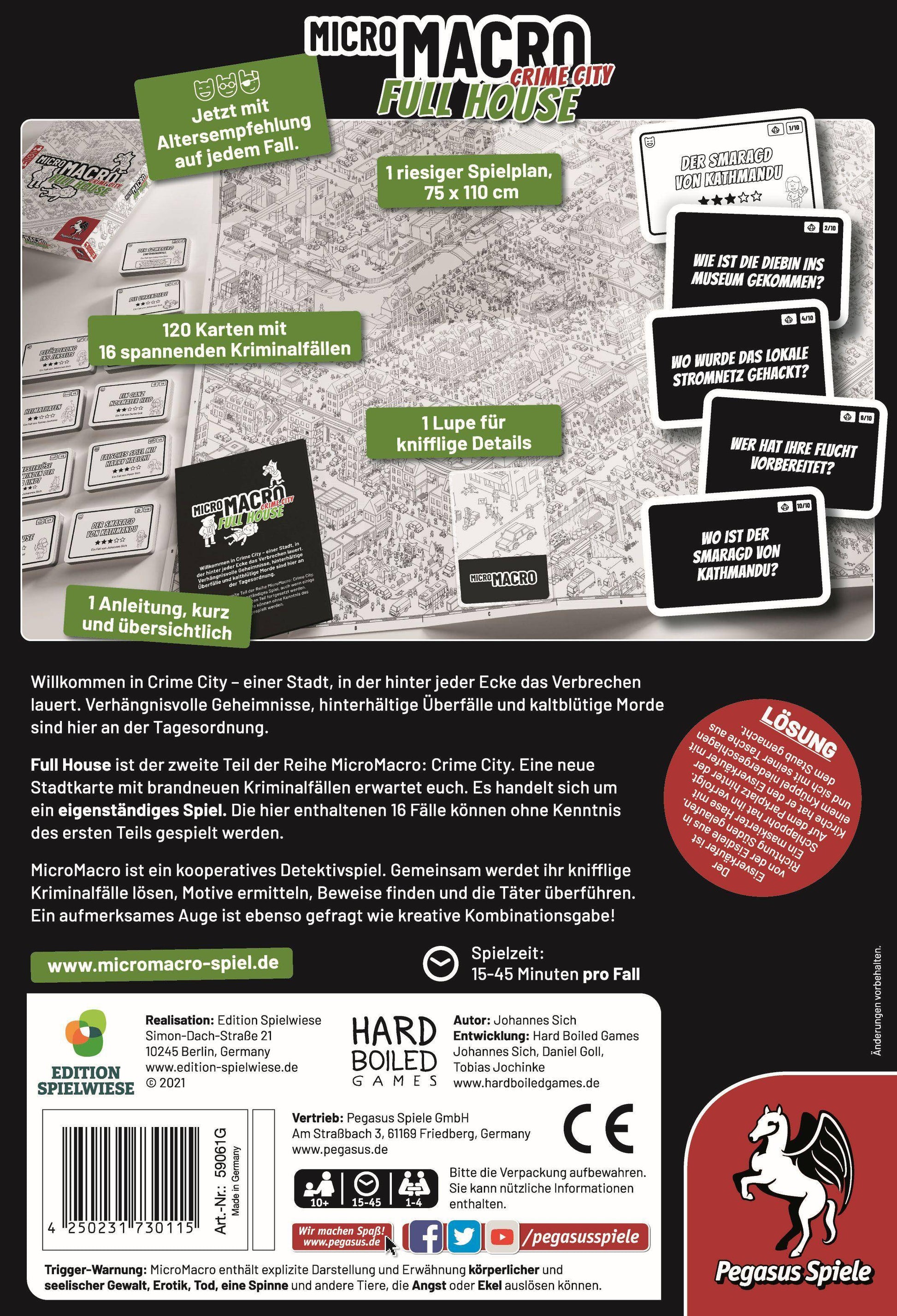 Im neuen Teil, MicroMacro: Crime City 2 – Full House, verschlägt es die Detektive abermals in die berüchtigte Stadt in schwarz-weiß, in der es vor Verbrechen immer noch so wimmelt. Das Spiel nimmt mit seinen 16 Fällen immer weiter an Fahrt auf und wird komplexer, raffinierter und natürlich auch noch ein bisschen krimineller. Die einzelnen Fälle sind nun mit Symbolen gekennzeichnet, damit es Eltern möglich ist, zu entscheiden, welche Fälle auch die jüngsten Ermittler in MicroMacro recherchieren und aufdecken dürfen.