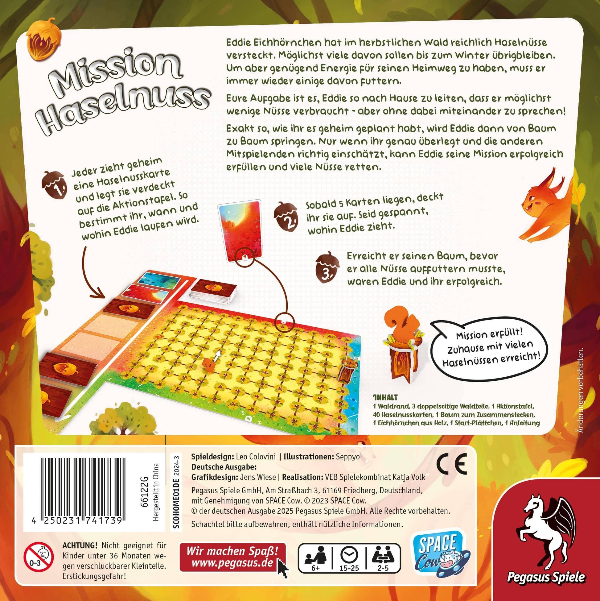 In dem kooperativen Mission Haselnuss ist es Aufgabe der Spielenden, das Eichhörnchen Eddie zurück zu seinem Nest zu führen und dabei möglichst wenige seiner Nussvorräte aufzubrauchen. In jeder Runde bewegen sie Eddie mit Haselnusskarten, die verschiedene Richtungen angeben, durch den Wald. Hierzu platzieren die Spielenden je eine Haselnusskarte verdeckt und ohne Absprache mit den anderen auf der Aktionstafel. Am Rundenende werden alle Karten von links nach rechts abgehandelt. Haben sich die Spielenden gegenseitig gut eingeschätzt, schafft Eddie es nach Hause bevor seine Haselnüsse ausgehen.