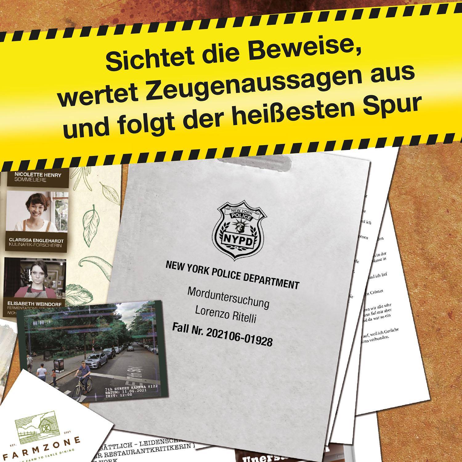 Ermitteln wie die Profis! Wer hat den Starkoch Lorenzo Ritelli ermordet? Dieser wurde tot in seinem New Yorker Restaurant aufgefunden. Wer könnte Interesse an seinem Tod haben? Welcher Zeuge hat kein Alibi? Wer konnte an die Mordwaffe gelangen? Viele Fragen, die unbedingt geklärt werden müssen! Allein oder im Team werden Zeugenaussagen geprüft, Dokumente und Fotos gesammelt. Auch Zeitungausschnitte und weiteres Beweismaterial landen in der Ermittlungsakte. Stück für Stück setzt sich ein Bild zusammen, das zum Täter führt.