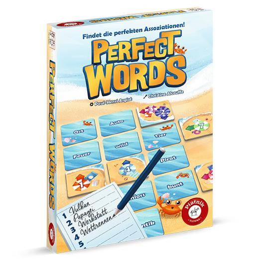 Perfekte Begriffe gesuchtWer bei den Begriffen „Spieleautor“ Paul-Henri Argiot und „Nominierung“ für den französischen Spielepreis As d‘Or 2024 sofort an „Perfect Words“ denkt, hat die Grundregel des neuen Wort-Assoziationsspiels bereits verstanden. Denn bei diesem kooperativen Kreuzworträtsel sind Wort-Kombinationen und dazu passende, perfekte Überbegriffe gesucht, auf die möglichst viele in der Spielerunde auch kommen.„Perfect Words“ gliedert sich in drei Spielphasen: Zuerst wird ein Kreuzworträtsel erstellt, indem reihum jeweils eine Wortkarte aus der offenen Auslage an bereits ausliegende Karten platziert wird. Ziel dabei ist es, Wortlinien zu bilden, deren Begriffe zusammen Sinn machen und zu einem Überbegriff passen. Pfeilkarten mit den Nummern 1 bis 10 begrenzen die entstehenden Wortlinien.Hat jede Wortlinie mindestens zwei Karten und sind gleichzeitig alle zehn Pfeilplättchen angelegt, startet die nächste Phase – das Assoziieren. Es gilt zu jeder der zehn Pfeilzahlen geheim einen sinnvollen Überbegriff zu notieren, der zur dazugehörigen Wortlinie passt. Da heißt es abzuwägen, wie die Anderen ticken und welche einfachen oder vielleicht kreativen Überbegriffe sie finden. Herausfordernd wird das durch die wichtigste Regel während des gesamten Spiels: Sprechen ist erlaubt, aber nie über Assoziationen, die einem durch den Kopf gehen – weder beim Notieren der Überbegriffe noch beim Legen der Wortkarten!Wie gut alle auf einer Welle reiten, zeigt sich in der finalen Wertungsphase. Hier werden nur Überein-stimmungen mit Muscheln belohnt. Je nachdem wieviele Muscheln das Team am Ende gesammelt hat, darf es sich über eine Bronze-, Silber- oder Gold-Medaille freuen. Echte Champions erhalten den Titel „Perfekte Wort-Meister“.Die 504 unterschiedlichen Wortkarten lassen keine Langeweile aufkommen und sorgen bei zwei bis sechs Personen ab 12 Jahren für langanhaltenden Rätselspaß. „Perfect Words“ beinhaltet mehrere Varianten mit unterschiedlichen Schwierigkeitsgraden und kann auch mit einem kompetitiven Element gespielt werden.