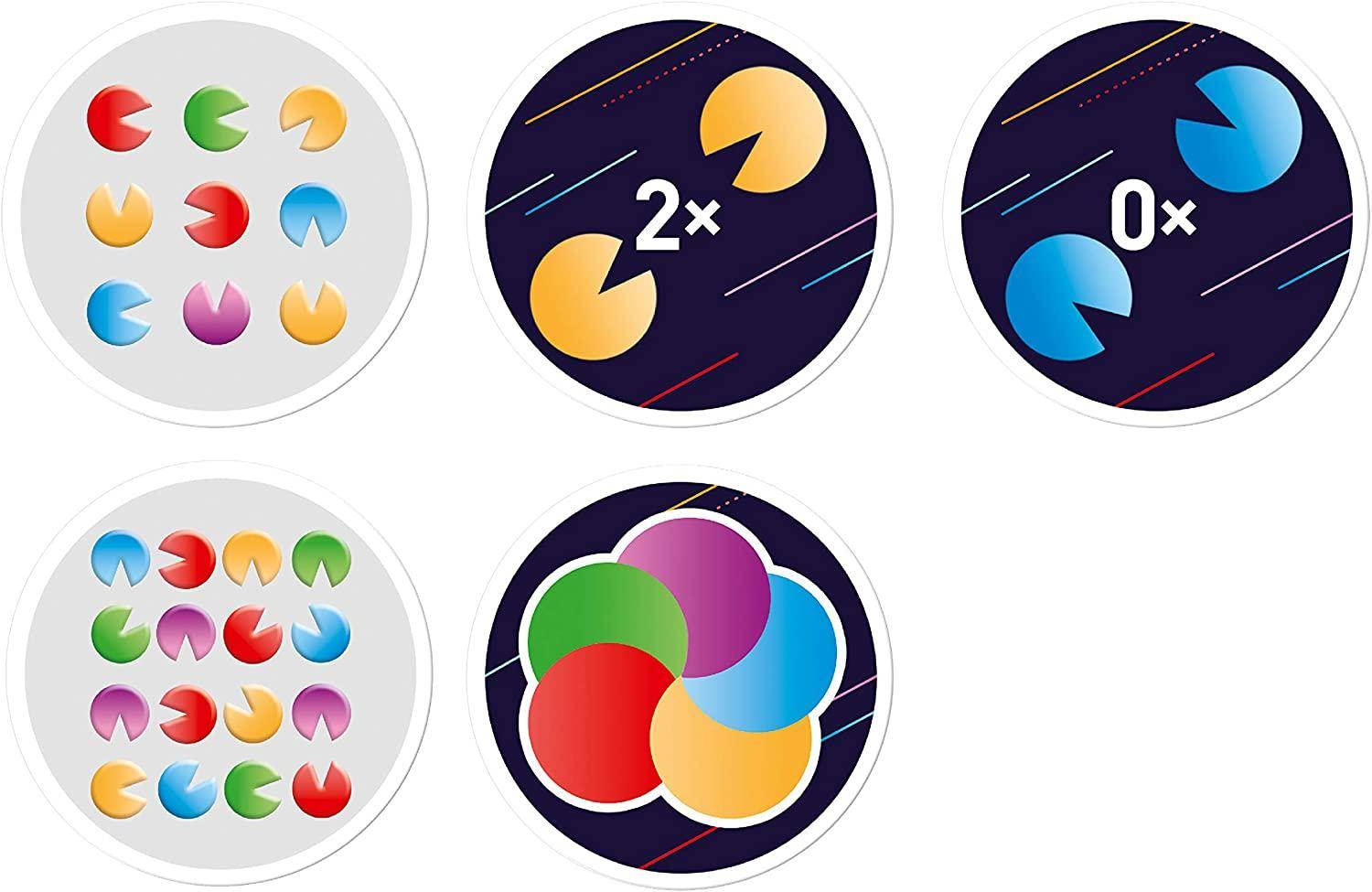 Und so geht es: Eine Karte wird aufgedeckt und die Rückseite der Karte auf dem Nachziehstapel legt fest, wonach die Spieler suchen. Entweder die häufigste Farbe, auf welchen Kreis zwei Kreisöffnungen zeigen oder auf welchen Kreis keine Öffnung zeigt. Wer es weiß, der nennt sofort die gesuchte Farbe! Da lautet die Devise: Genau hinsehen und schnell sein, denn man hat nur einen Versuch! Das sorgt für Spaß und Spannung bis zum Schluss! Und weil es so schnell war, wird gleich noch eine Runde gespielt!