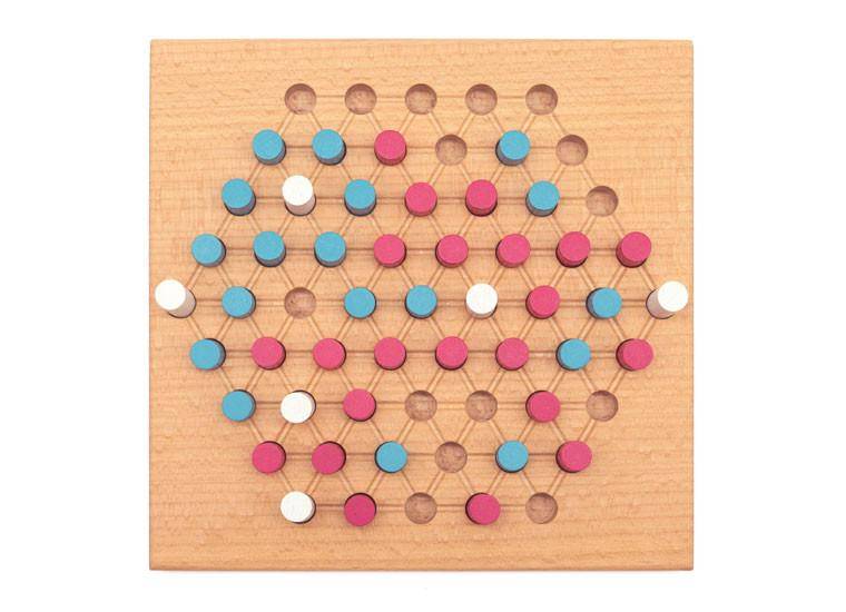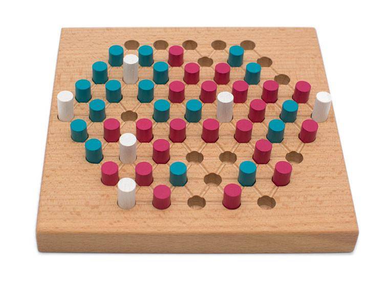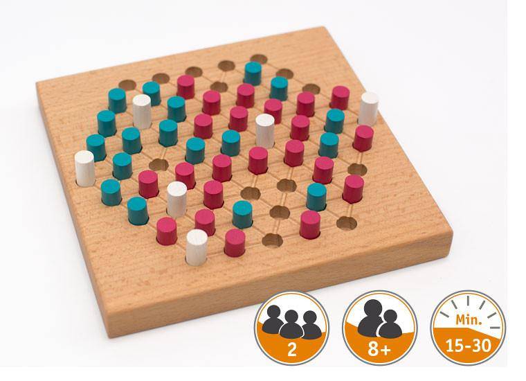 Viele Türme braucht die Gruppe.Sechs weiße Türme stehen auf dem Brett, die passenden Spielsteine dazu sind in 'Beere' und dunklem Türkis gehalten. Schon die Farben vermitteln Urlaubsfeeling. Und so wird gespielt:Immer abwechselnd ziehen die Spieler einen beliebigen Turm, immer in gerader Linie und ohne andere Spielsteine zu überspringen.Anschließend setzen sie direkt neben den soeben bewegten Turm einen eigenen Spielstein.Zug für Zug werden die Spielsteine auf dem Brett mehr und es entstehen Gruppen gleichfarbiger Spielsteine. Wichtig ist es, die Türme in die eigenen Gruppen mit einzubinden und sich nicht vom Spielpartner den Zugang zu diesen verbauen zu lassen.Nur das bringt am Ende die Siegpunkte. Eine Gruppe gleichfarbiger Spielsteine ohne angrenzenden Turm ist wertlos.Kurze Regeln, die aber jede Menge Knobelspaß mit sich bringen. Achtung! Nicht für Kinder unter drei Jahren geeignet. Kleinteile können verschluckt werden.für 2 Spieler ab 8 JahrenDauer: ca. 15 – 30 MinutenBuche massiv, geölt, 14,5 x 14,5 cmSpielsteine sind Holzstecker in weiß, Beere und türkis