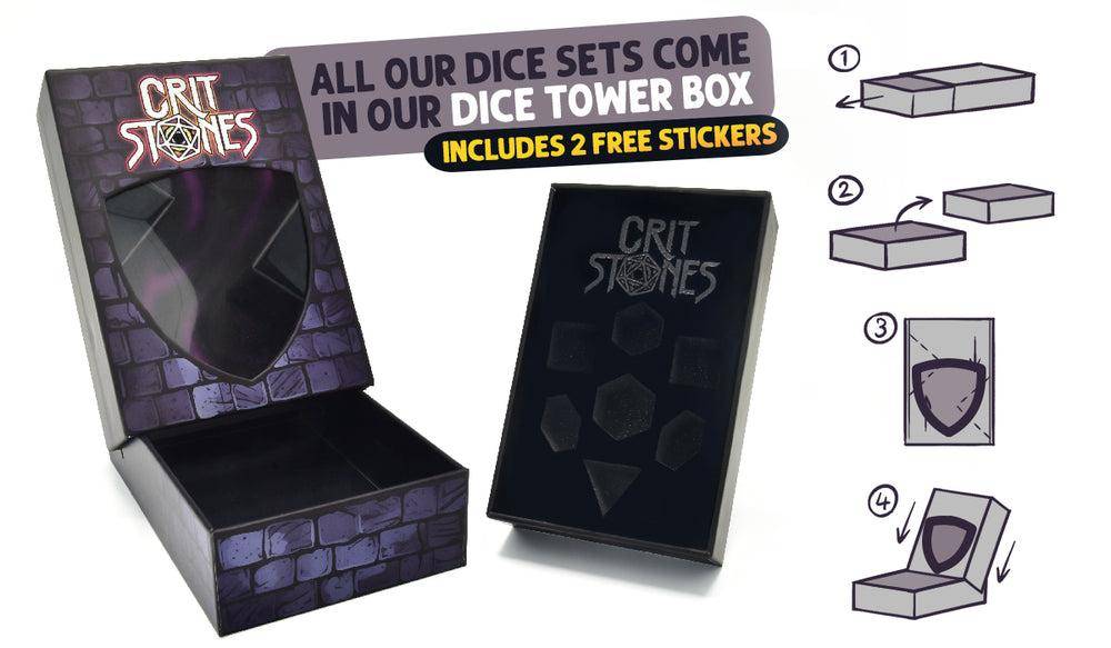 - Einzigartige Würfelturm-Box: Um den bestmöglichen Mehrwert zu bieten, wurde eine einzigartige Box entwickelt, die deine Würfel nicht nur mit hochwertigen Schaumstoffeinlagen schützt, sondern sich auch in einen Würfelturm verwandeln lässt! Jede Box enthält außerdem zwei hochwertige GlassStaff-Vinylaufkleber und eine besondere Überraschung, die du beim Auspacken entdecken wirst.