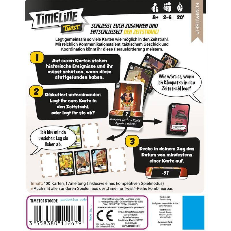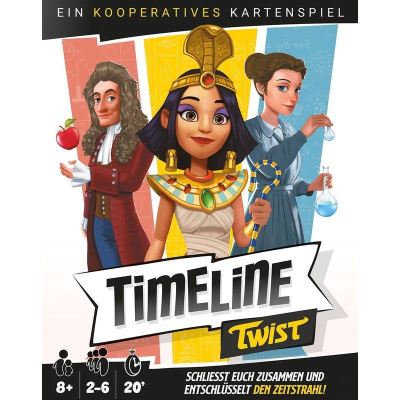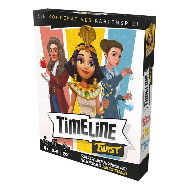 Mit der komplett neu konzipierten Wiedereinführung der beliebten Familienspiel-Reihe werdet ihr in Timeline Twist vor die Herausforderung gestellt, die historischen Ereignisse auf euren Karten gemeinsam in den Zeitstrahl einzusortieren. Auf euren Karten stehen historische Ereignisse und ihr müsst schätzen, wann diese stattgefunden haben. Ihr könnt untereinander diskutieren, ob die Karten in den Zeitstrahl eingeordnet werden oder abgelegt werden sollen. In jeden Zug muss das Datum von mindestens einer Karte aufgedeckt werden. Testet gemeinsam euer Wissen und lasst euch von den historischen Fakten verblüffen!