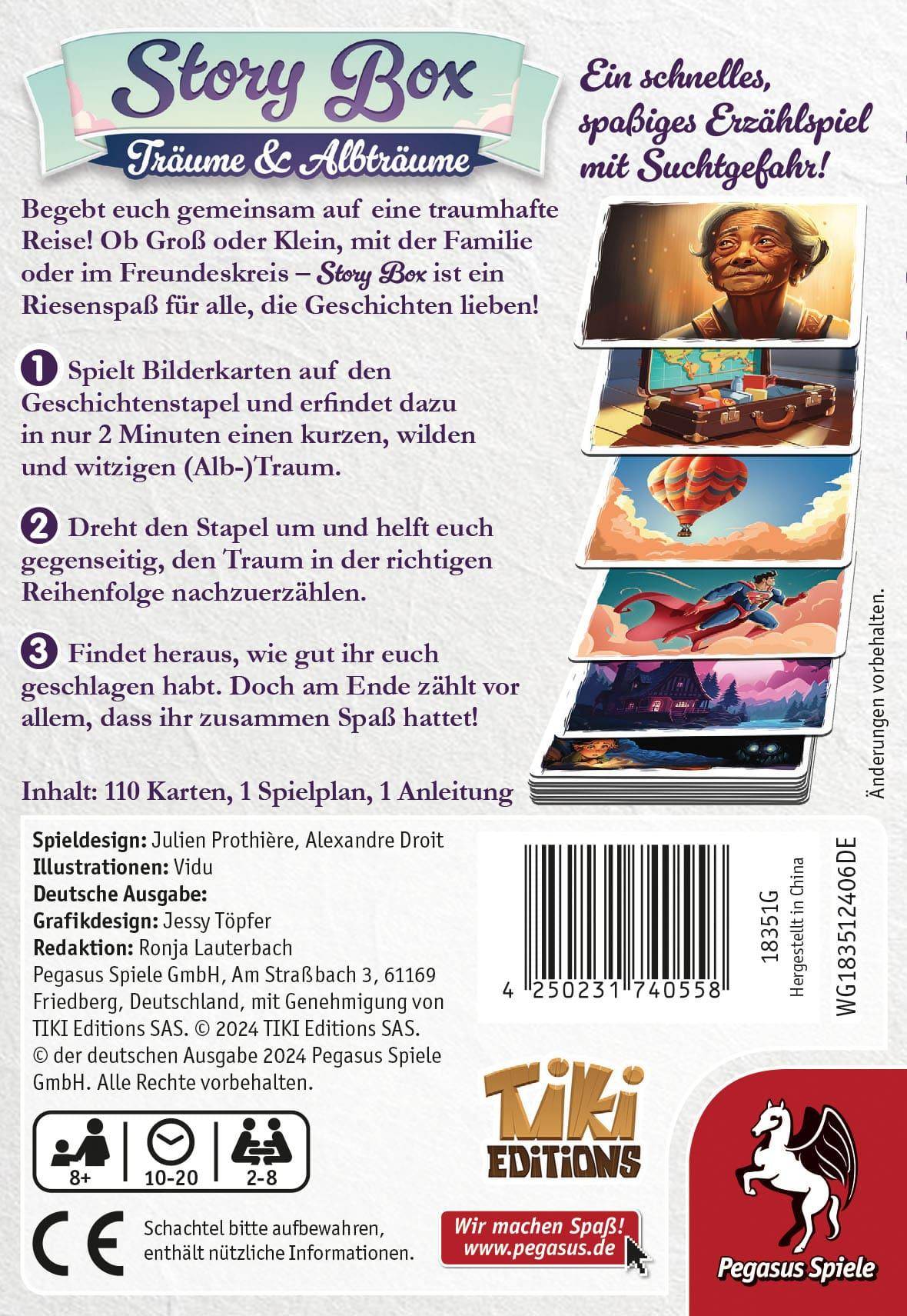 Story Box lädt mit den beiden Themenboxen Abenteuer und Träume & Albträume zum gemeinsamen Geschichtenerzählen ein. Ohne feste Reihenfolge werden Bilderkarten auf einen Geschichtenstapel gespielt. So entspinnt sich in kurzer Zeit ein verrücktes Abenteuer oder ein wahnwitziger (Alb-)Traum. Der Kreativität der Spielenden sind bei der Interpretation der Karten keine Grenzen gesetzt. In der zweiten Phase wird der Geschichtenstapel umgedreht und die Geschichte gemeinsam aus dem Gedächtnis bzw. Karte für Karte erneut erzählt. Die Karten helfen dabei, sich an alle Details zu erinnern.