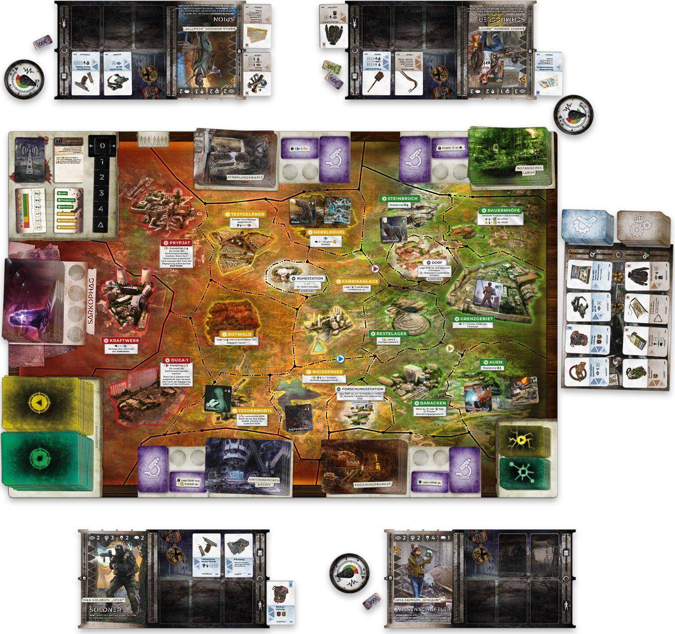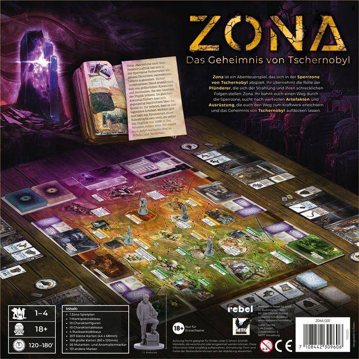 ZONA ist ein Abenteuer- und Überlebensspiel für ab en von Maciej Drewing und Krzysztof Glosnicki. Jede Runde bewegt ihr euch durch die verstrahlte Landschaft und begegnet Bedrohungen wie mutierten Bären oder seltsamen Anomalien, die Zeit und Raum verzerren. In Bunkern könnt ihr euch ausrüsten, ausruhen, eure Gegenstände reparieren und vor regelmäßigen Strahlungswellen Schutz suchen. Am Ende jeder Runde zieht jeder eine Begegnungskarte, die jeweils ein spannendes Abenteuer bereithält, komplett mit Entscheidungsmöglichkeiten, großen Risiken und manchmal auch beeindruckenden Artefakten.