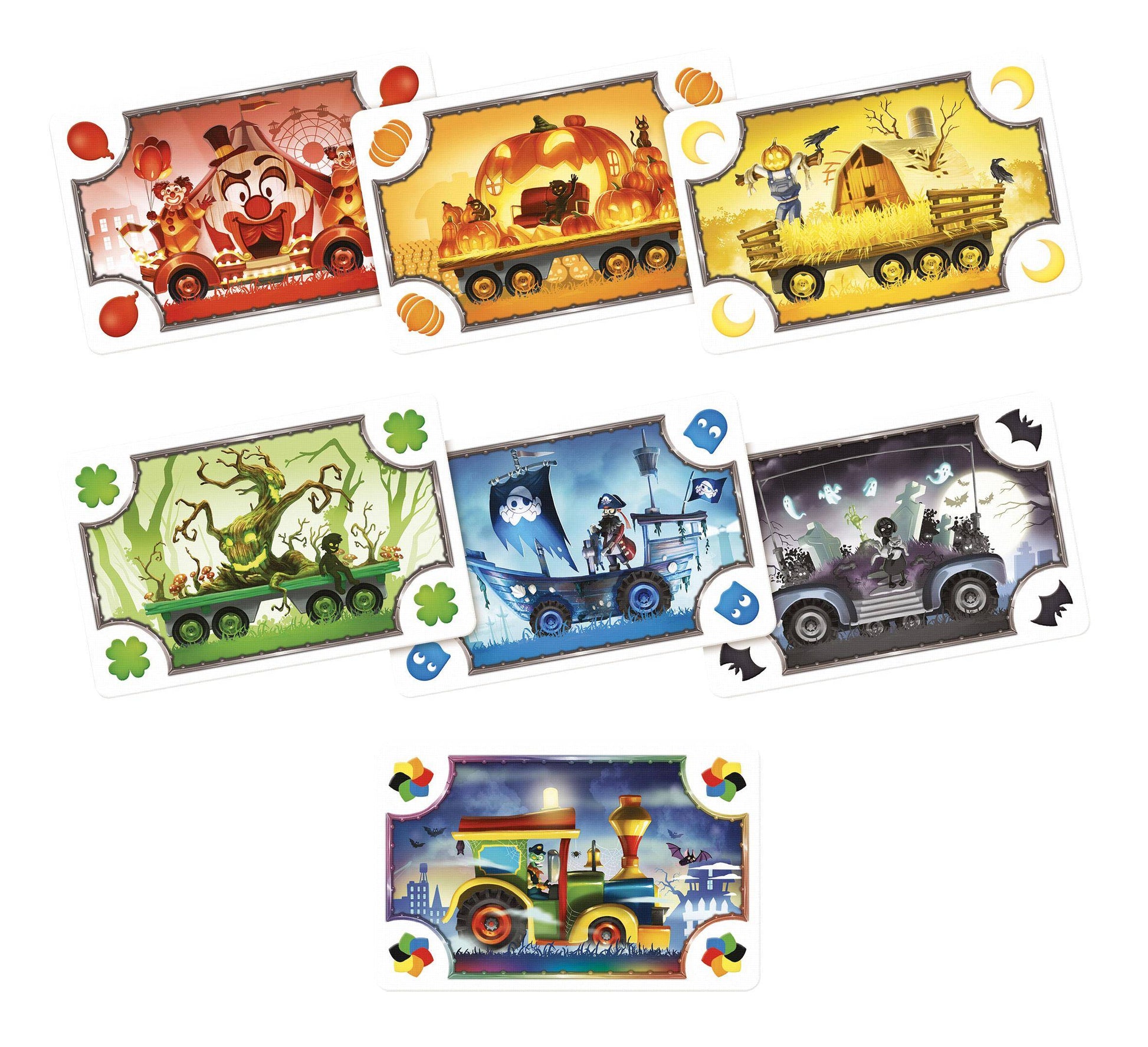 Zug um Zug: Gruselfahrt ist eine vereinfachte Kinderversion des beliebten Familienspiel-KlassikersZug um Zug mit Halloween-Thema. Im Spiel sammelt ihr Festwagen-Karten und spielt sie aus, um Strecken zwischen verschiedenen Orten in einer gruseligen Kleinstadt zu nutzen. Wer es zuerst schafft, mit den eigenen Geister-Waggons zu genügend gespenstischen Orten zu rasen, gewinnt das Spiel.