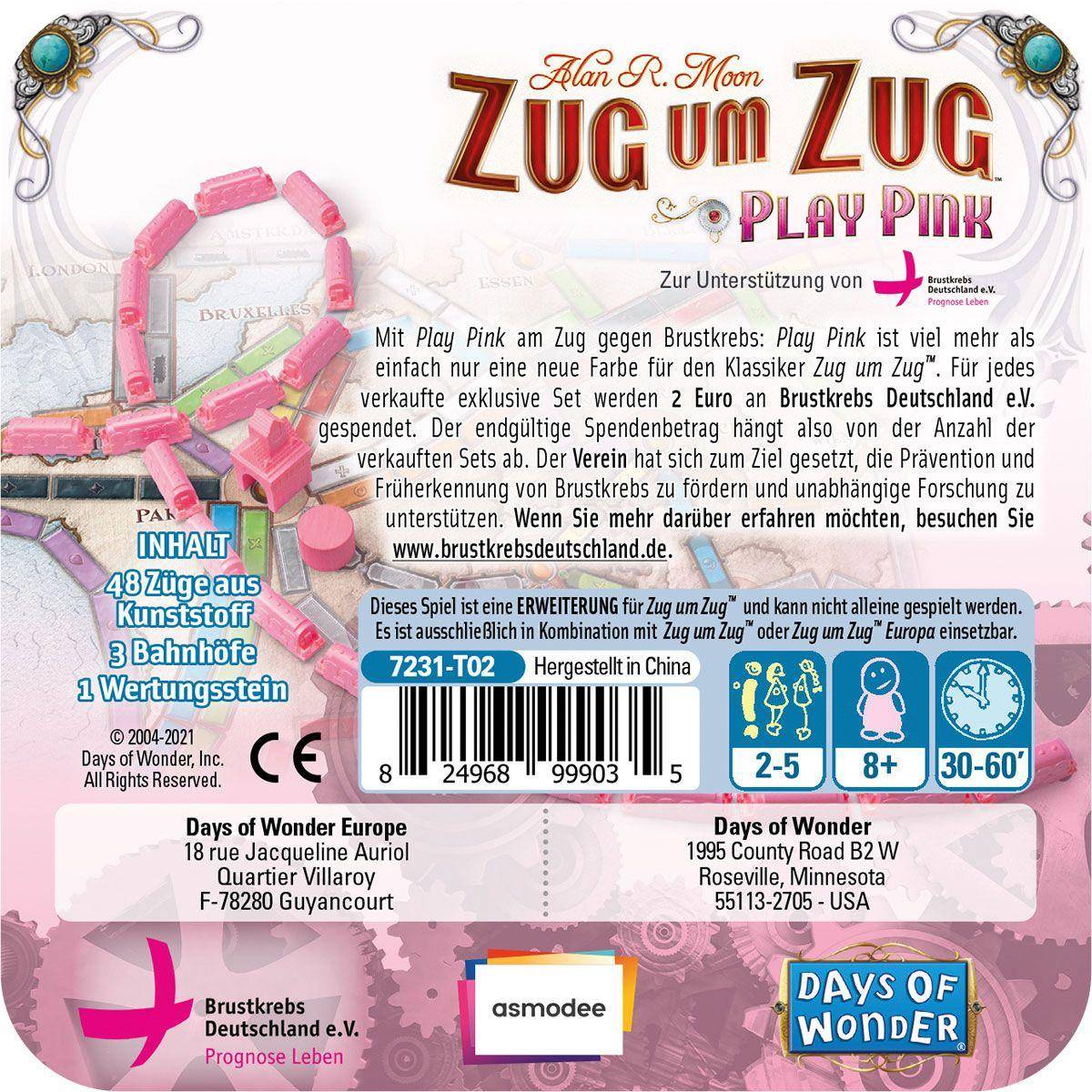 Die Welt von Zug um Zug mit einer neuen Farbe erleben. Play Pink ist ein limitiertes Spiel-Set für alle Fans der Reihe. Es erweitert die Grundspiele von Zug um Zug und Zug um Zug – Europa um neue Züge und Bahnhöfe in der Farbe Pink.